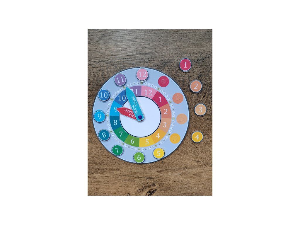 Farebný ciferník obsahuje odnímateľné čísla na suchý zips, ktoré si dieťa priraďuje na správne miesto. Vďaka manipulácii si prirodzene upevňuje poradie čísel a lepšie chápe rozloženie hodín.