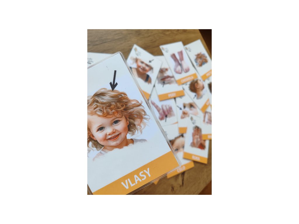 Kartičky sú obojstranné – na každej strane sa nachádza jedna časť tela s názvom (napr. vlasy, pery, chodidlá).