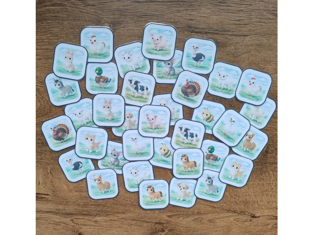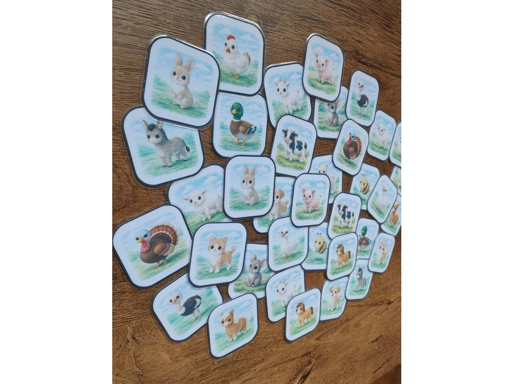 Kartičky zobrazujú známe hospodárske zvieratá ako krava, prasa, sliepka či kôň. Farebné a zrozumiteľné ilustrácie pomáhajú deťom prirodzene spoznávať zvieratá a rozširovať si slovnú zásobu.