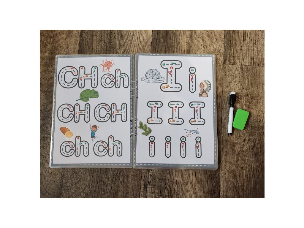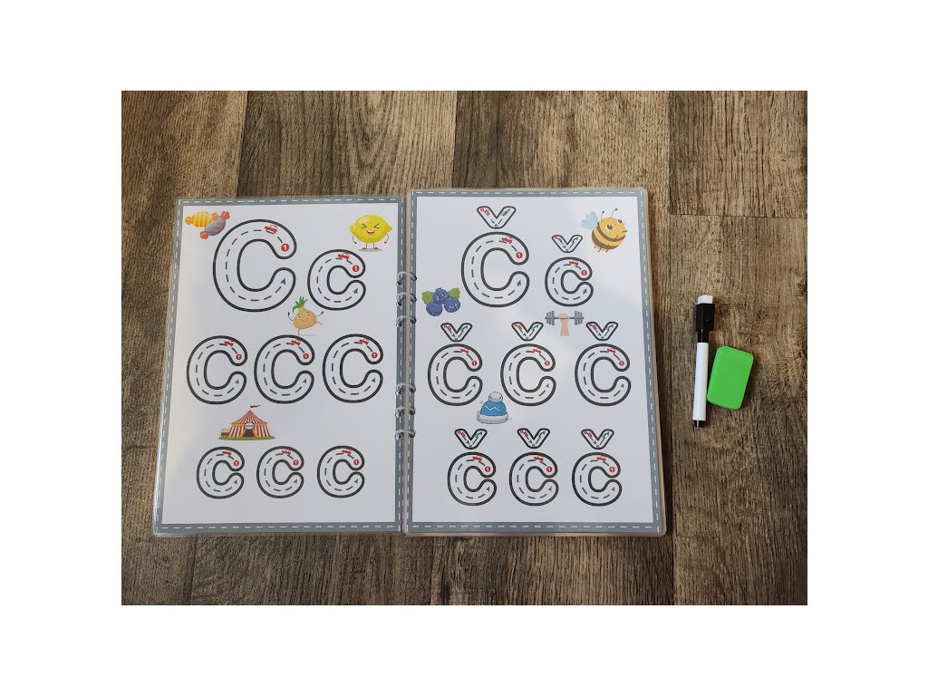 Na každej strane sa nachádza jedno písmeno. Vo vnútri písmena sú vyznačené vodiace čiary, ktoré pomáhajú dieťaťu správne viesť ruku pri písaní. Po trase sa „pohybuje“ autíčko, ktoré robí učenie hravým a motivujúcim.