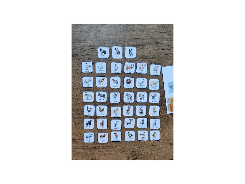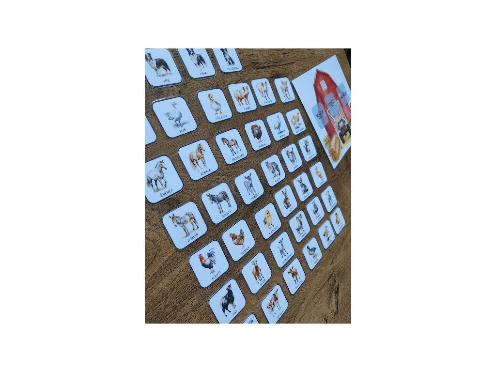 Vzdelávacia pomôcka na suchý zips, ktorá učí deti rozpoznávať hospodárske zvieratá a ich mláďatá.