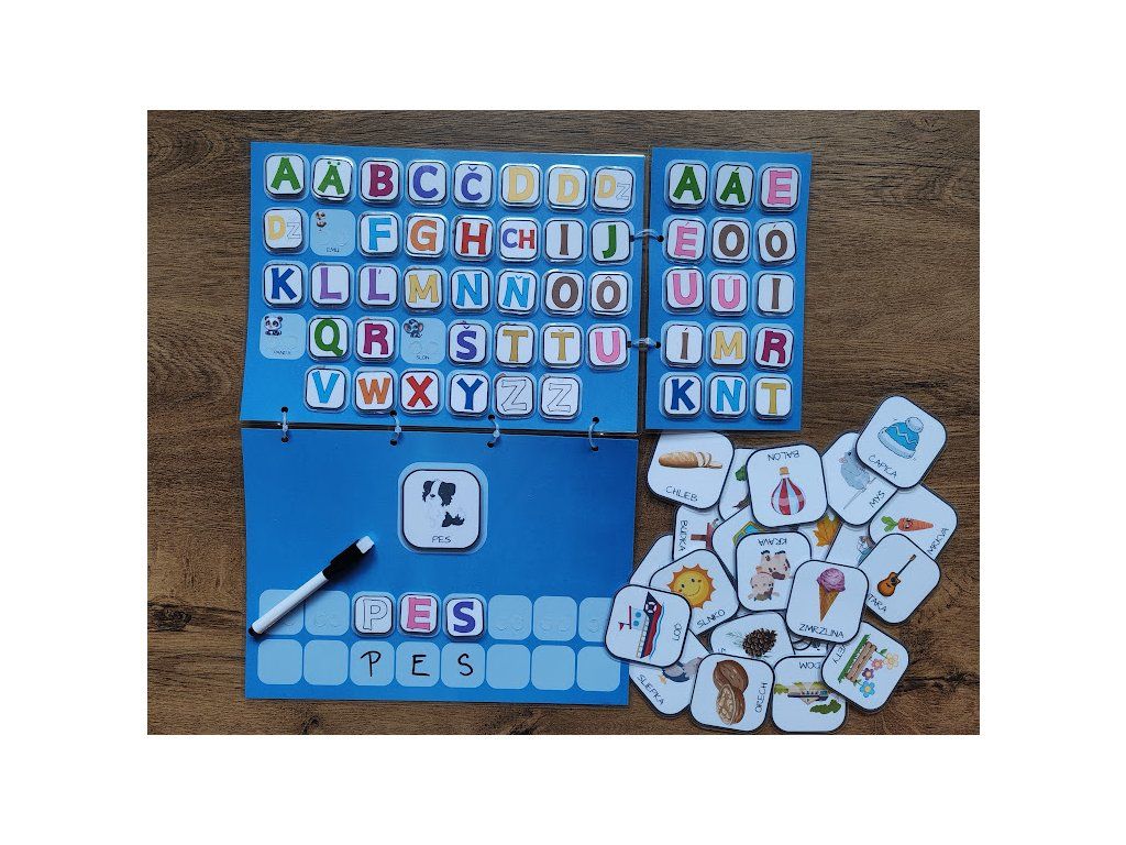 - písmenká na suchý zips a mazateľná fixka pre interaktívne učenie