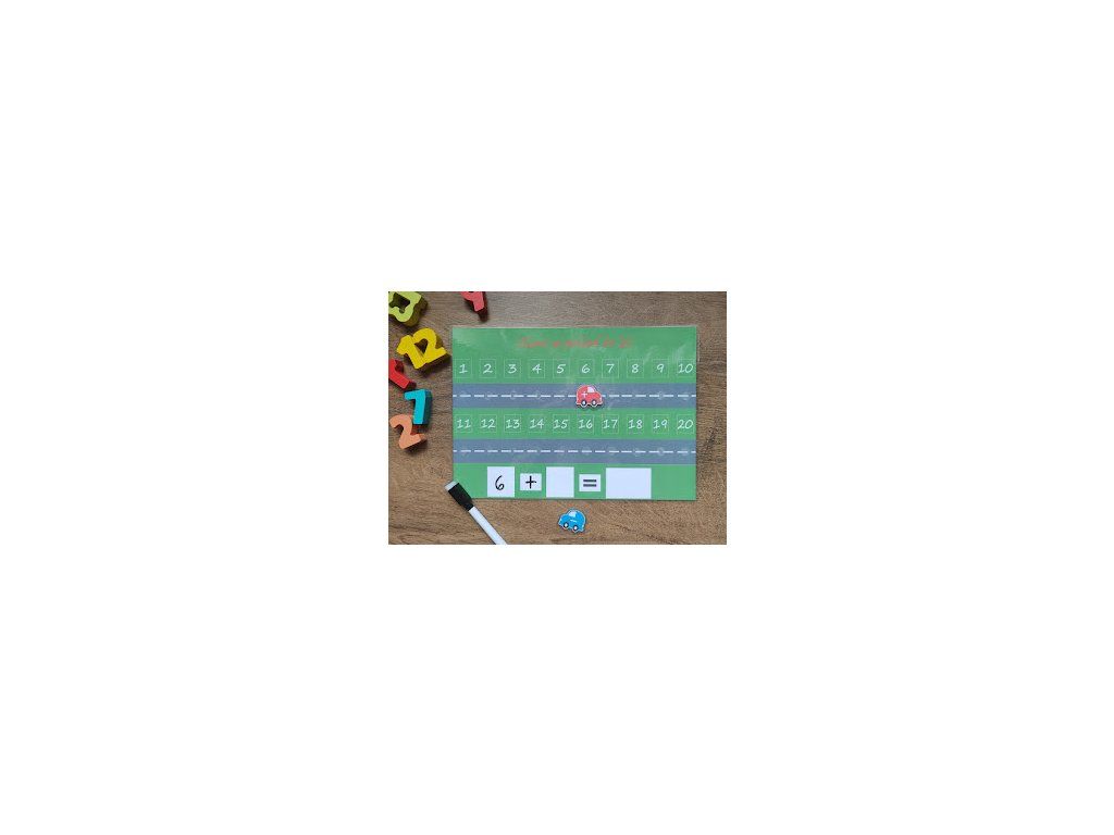 K tabuľke patria dve farebné autíčka: červené so znamienkom plus a modré so znamienkom mínus. Pri riešení príkladu (napr. 6 + 4) sa autíčko položí na číslo 6 a posúva sa po ceste o 4 políčka vyššie, až kým nedorazí na výsledok – číslo 10. Rovnako funguje odčítanie s modrým autíčkom.